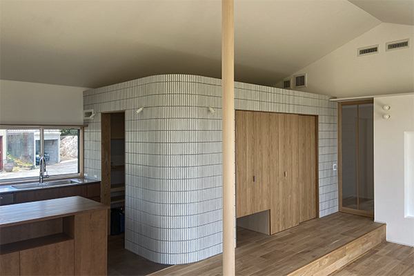 白を基調としたLDKは、センスの良いタイルと印象的なR壁がアクセントとなり、空間がより広く感じられます。