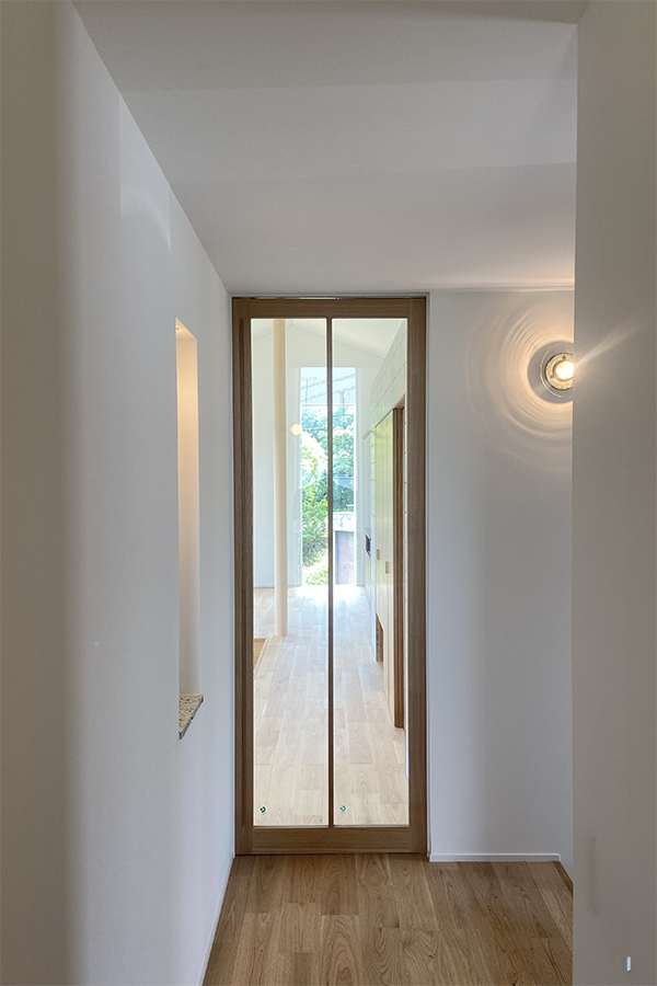 平屋ならではの水平ラインを活かした廊下は、外の景色へと一直線にのびて空間に豊かな奥行きを生み出します。