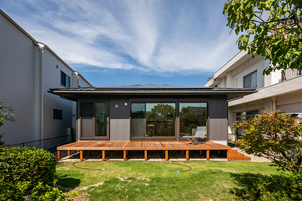 大開口から広がる庭は、自然との一体感が感じられるプライベートガーデンとして、家族や愛犬と過ごすもう一つの寛ぎの場です。深い軒とテラスが室内外をゆるやかに繋ぎ、豊かな奥行きを住まい全体にもたらします。