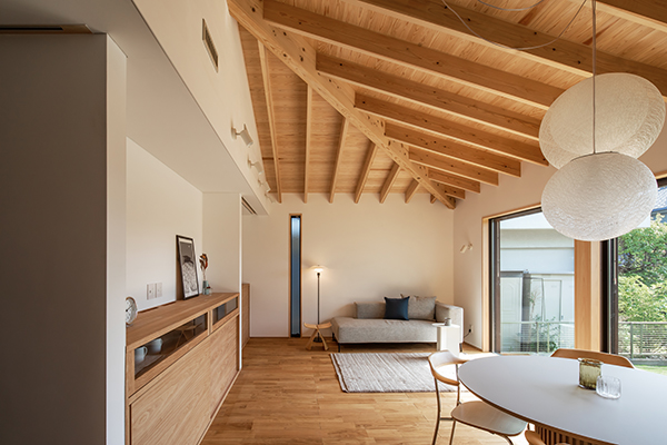 リズムよく刻まれる現し梁が、ダイナミックな開放感とともに落ち着きのある空間を演出します。