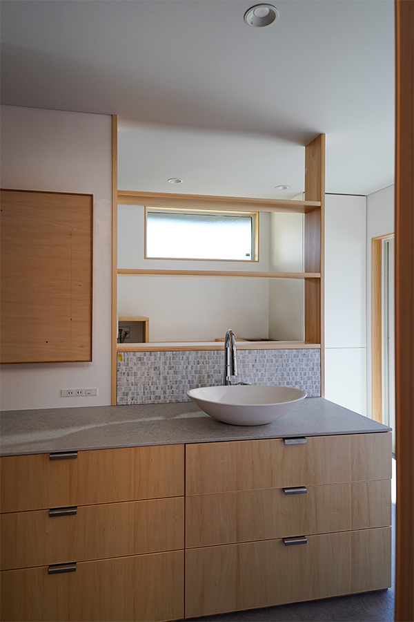 洗面脱衣、トイレ、浴室など、水まわり空間を1箇所にまとめることで家事効率を高めつつ、収納や作業スペースも使いやすく設計しました。