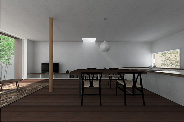 リビングダイニングに配した円柱が適度な区切りとなりつつ、ダウンフロアのキッチンが空間の重心を下げ、壁一面に流れるように配されたカウンターと東西の窓によって、一層の奥行きと広がりを生み出します。