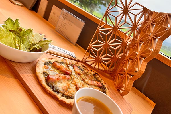 作業場の隣にはカフェが併設されていて、店内には曲面の組子に照明器具を仕込んだ素敵な作例も。