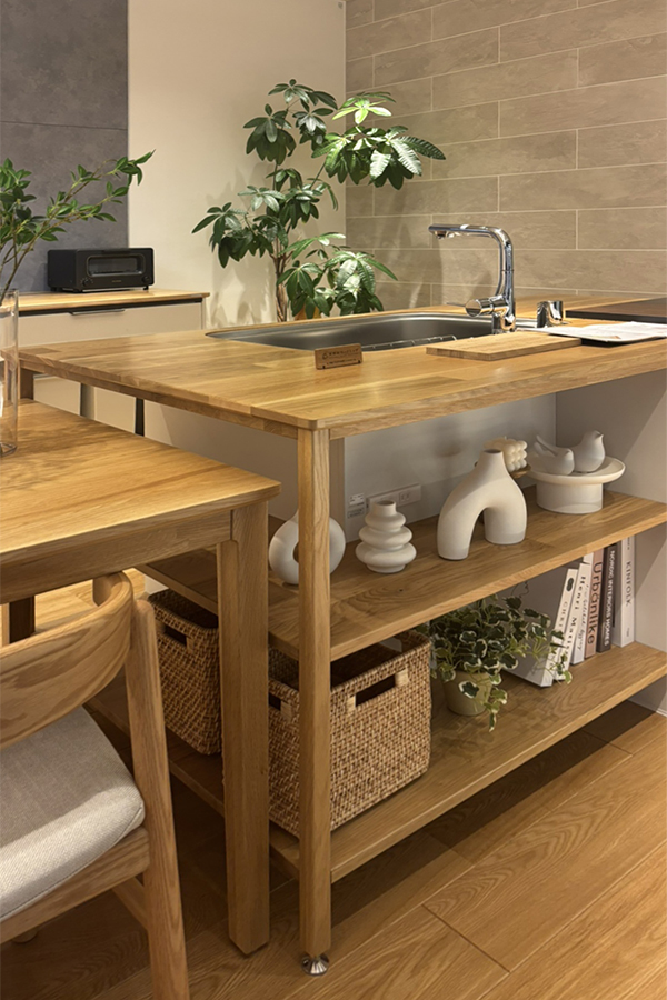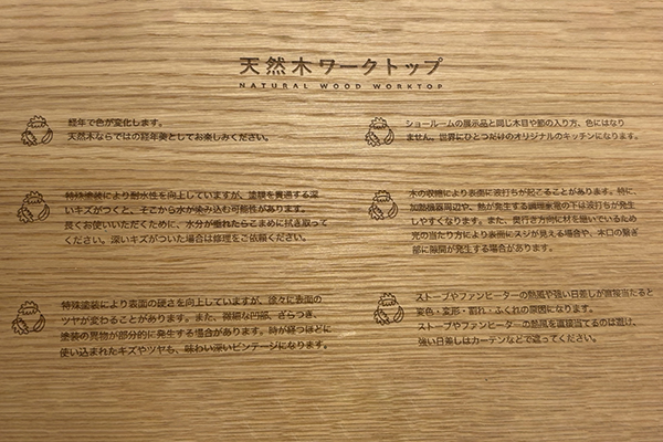 正直「木製のキッチンってどうなんだろう?」と思いましたが、5層のウレタン塗装によって水や傷に強く、安心して使えるとのことでした。(ただし、熱には注意が必要です)