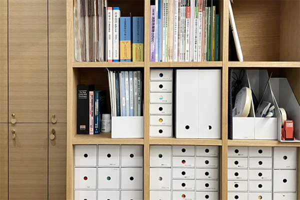 また、「隙間なくぴったり!」「ファイルボックスの背が見えるかたちできれいに収納!」など、見た目の美しさも維持したいのですが、だんだんと普段使う書類や文具は取り出しやすさを優先して隠さないスタイルに…。