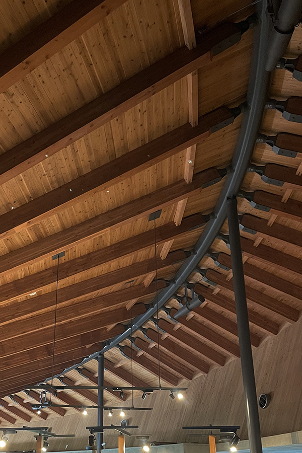 屋根を支える集成材の垂木は十数メートルもある巨大な材料で、てっぺんにある魚の背骨のように通る棟木のスチールパイプと1本1本金属のプレートで繋がれています。