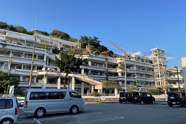 屋上には建築時に使われたという手づくりのクレーンが残されており、その存在感に驚かされます。今も「入居者募集中」の看板が出ており、建物が生きつづけているようでした。