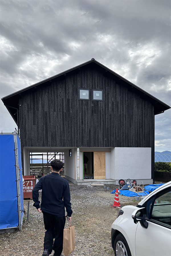 黒く見える外壁には焼杉が使われていて、約2500本もの杉を地域の方とも協力しながら一つ一つ焼いてつくったそうです。