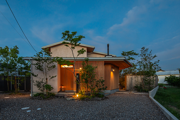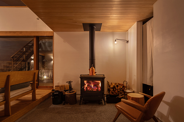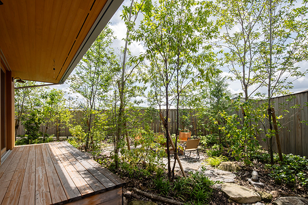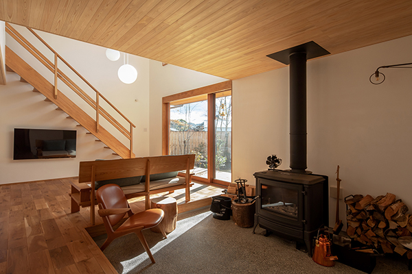 「土間リビングと薪ストーブのある家」は、光、風、風景を要素とした豊かなお庭によって、住まい手が心地よく過ごすことができる「中間領域」がある住宅です。