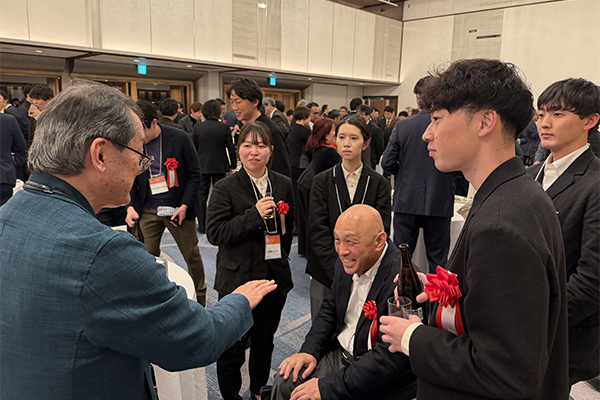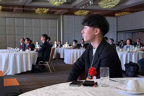 当日は、発表者の三宅をはじめ、社長の阿部一雄、専務の阿部将也、そして新入社員3名が現地に駆けつけ、緊張感と熱気に包まれる会場でプレゼンを見守りました。