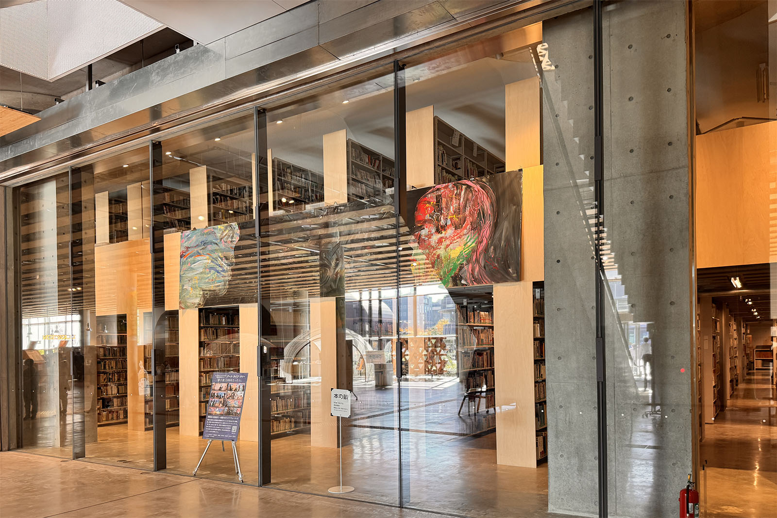 1階には閉架書架(蔵書室)がありますが、こちらもガラスで囲われているため内部がよく見え、本に興味を持ってもらうための工夫のひとつのようにも感じられます。