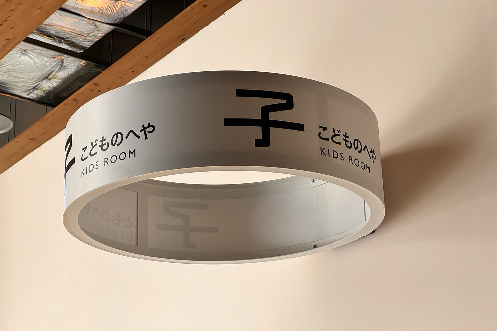 サークル状のプレートに大きな単漢字で用途を表し、小さな文字で意味を表しています。誰にでもわかりやすい工夫がほどこされた楽しい表示でした。