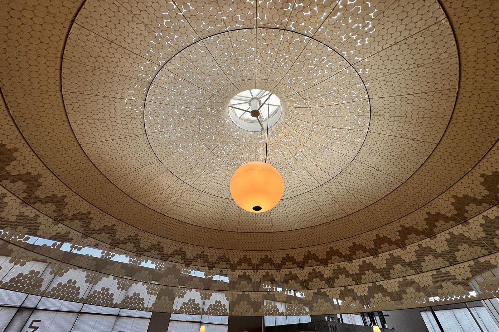 建物を周囲から眺めるとガラスとフレームの落ち着いた佇まいですが、2階の図書館に上がっていくと、「グローブ」と呼ばれる大きなランプシェードのような太陽光の取り入れ口が大小さまざまにぶら下がっており、とても印象的です。
