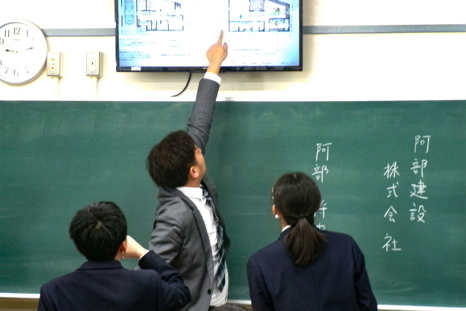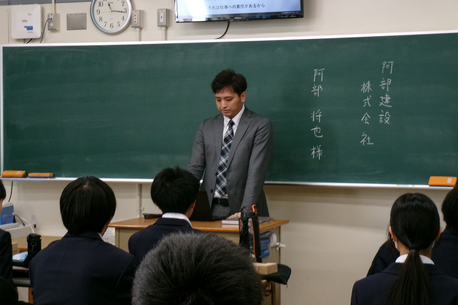 日々現場で汗を流していますが、先月は職業体験の講師として、専務の阿部将也、先輩大工の松下、そして私の3人で、守山東中学校を訪問してきました。