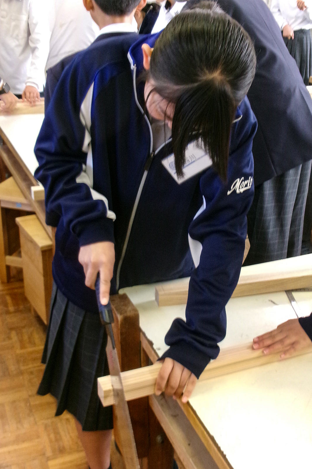 この体験活動の一貫として、生徒たちにカンナやノコギリに触れてもらうため、私たち社員大工も同行しました。