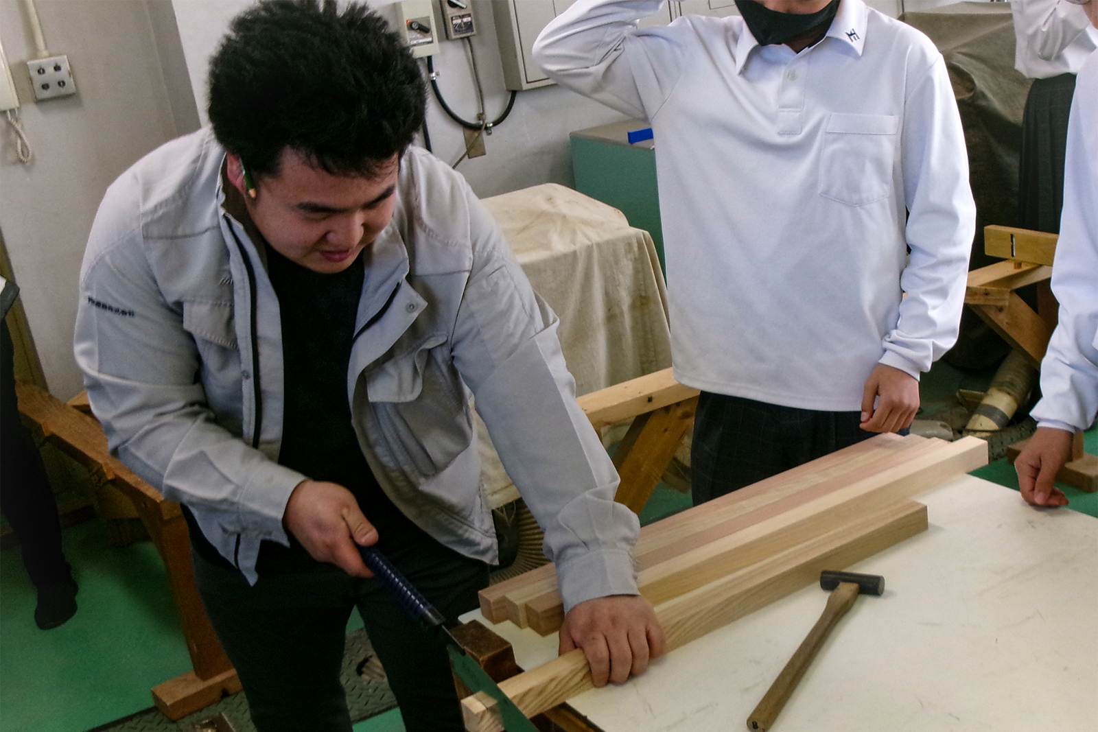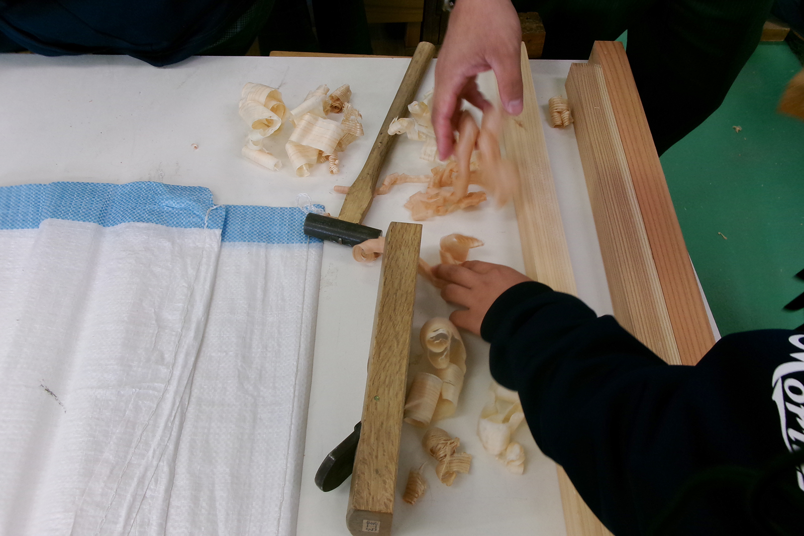 生徒からは「やっぱり俺たちとは精度が全く違う」「大工さんは簡単そうにやっているけど全然うまくいかない」などの声が聞こえてきました。職人としての技術を伝えられたことに一安心しつつも、苦戦しながら懸命に取り組む生徒の姿に、改めて襟を正す思いになりました。