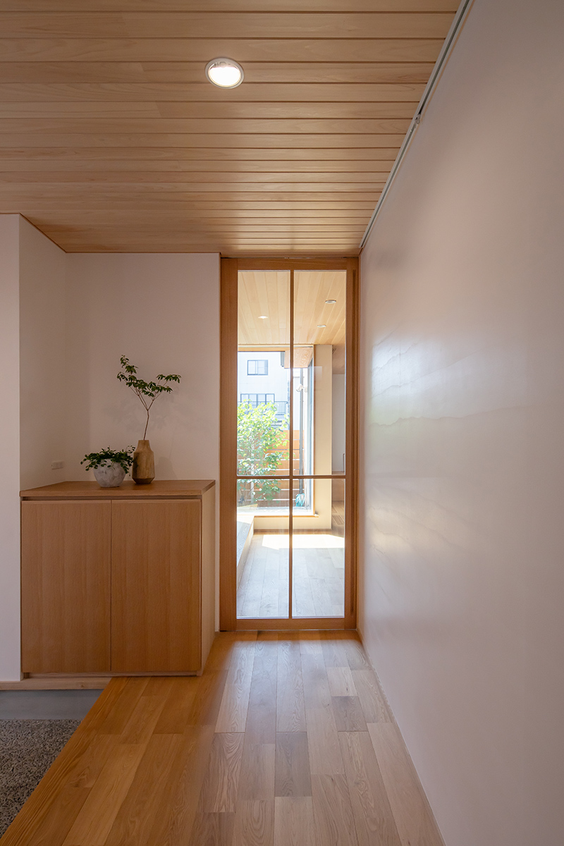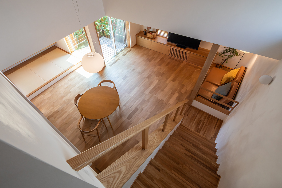 玄関からリビング、吹抜けから2階ホール、–––すべての空間が一目でわかるのではなく、進むほどに景色や光が徐々に姿を変えていくような、視線の流れをデザインしました。実面積以上の広がりや奥行きと共に、時の移ろいや場所によって、さまざまな表情を見せてくれます。暮らしの中でふと感じるその静かな彩りが、日々の心地よさや愉しさを一層深めてくれます。