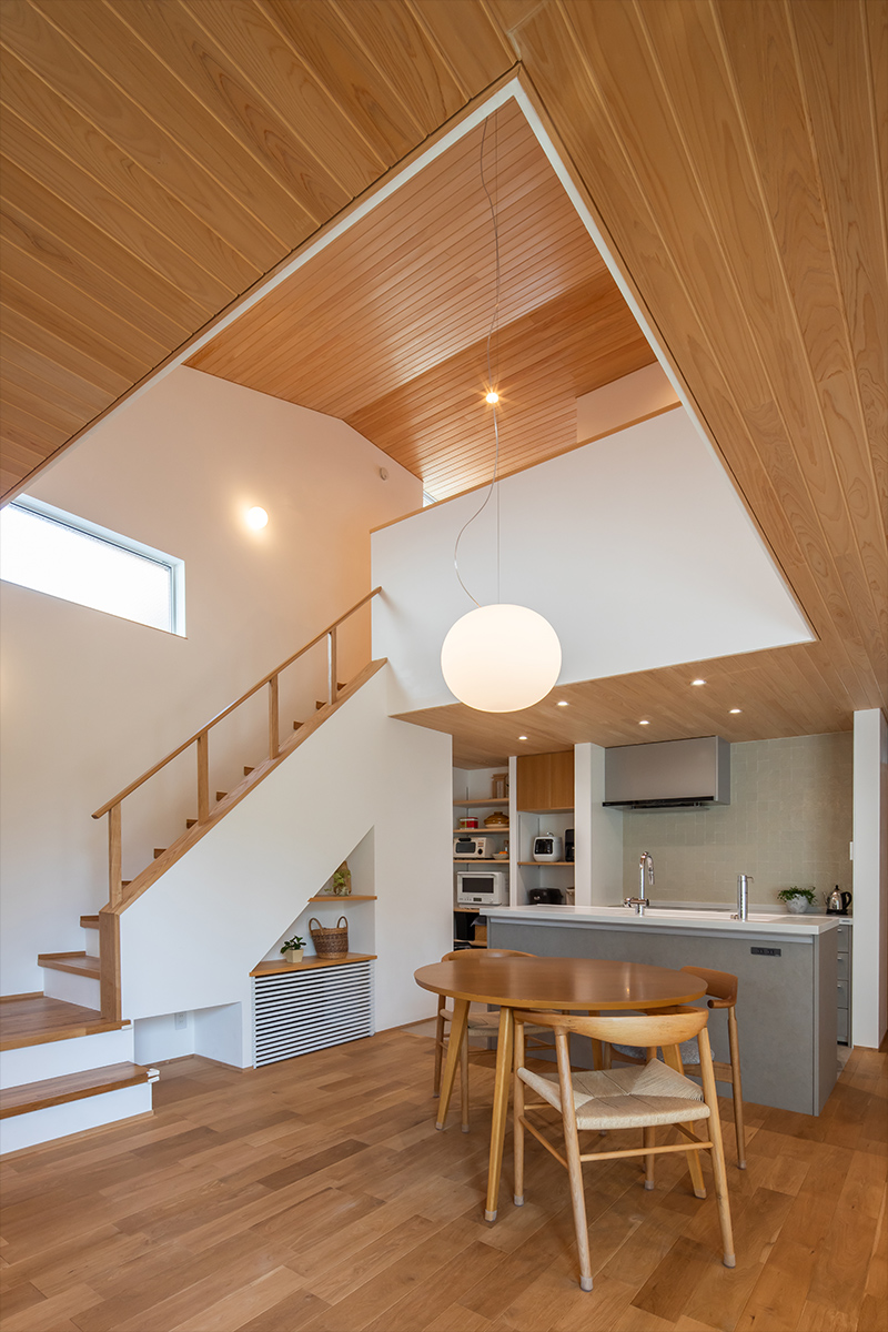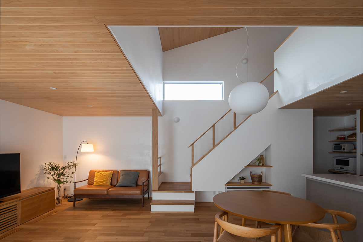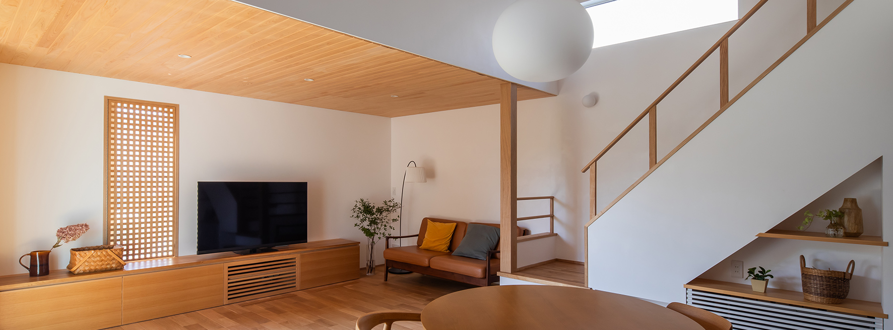 漆喰、ナラ、板張り天井が織りなす自然素材の心地よさ。細部まで丁寧に設計されたフォルム一つひとつが洗練された住まいをかたちづくります。ファサードデザインから、開口部、素材、照明、動線計画まで、施主と担当が対話を深めながら、思索を積み重ね完成した住まいです。