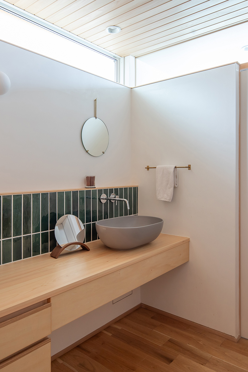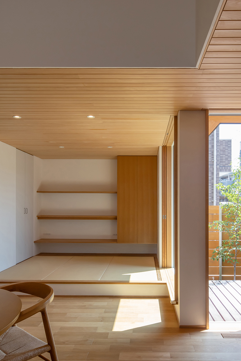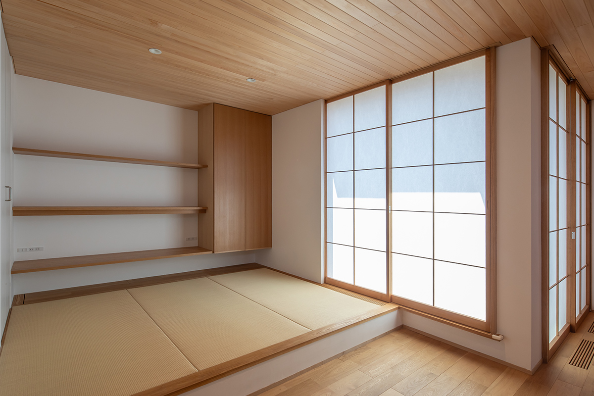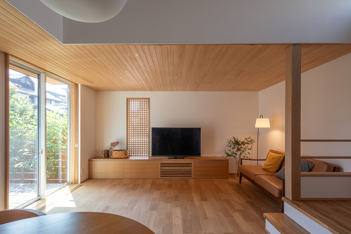 漆喰、ナラ、板張り天井が織りなす自然素材の心地よさ。細部まで丁寧に設計されたフォルム一つひとつが洗練された住まいをかたちづくります。ファサードデザインから、開口部、素材、照明、動線計画まで、施主と担当が対話を深めながら、思索を積み重ね完成した住まいです。