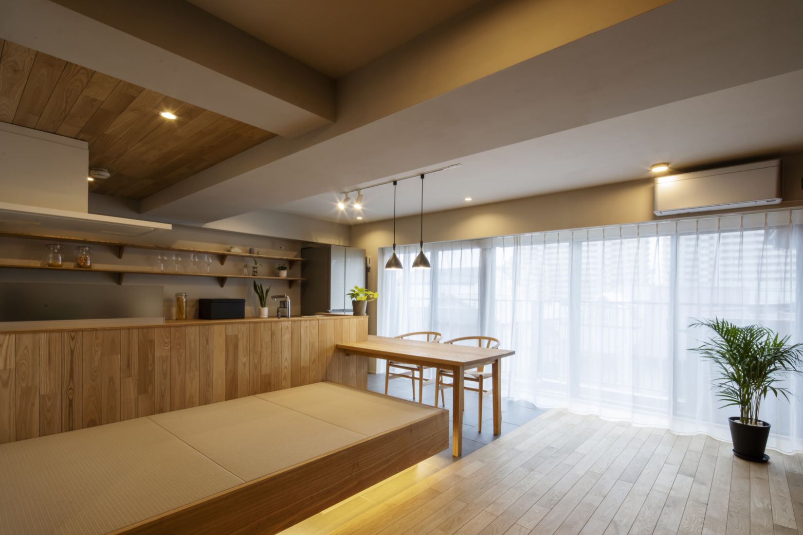 阿部建設本社併設のショールームは、築50年の平屋づくりをリノベーションした、新しいデザインの木の家です。