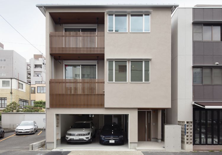 特殊な集成材や接合金具を使う「SE構法」を採用。地震に強いため、木造でありながらインナーガレージや吹き抜けなど、自由度の高い空間設計が特徴です。「新栄の家」には、2台の並列駐車が可能なインナーガレージを設けました。