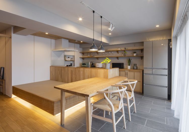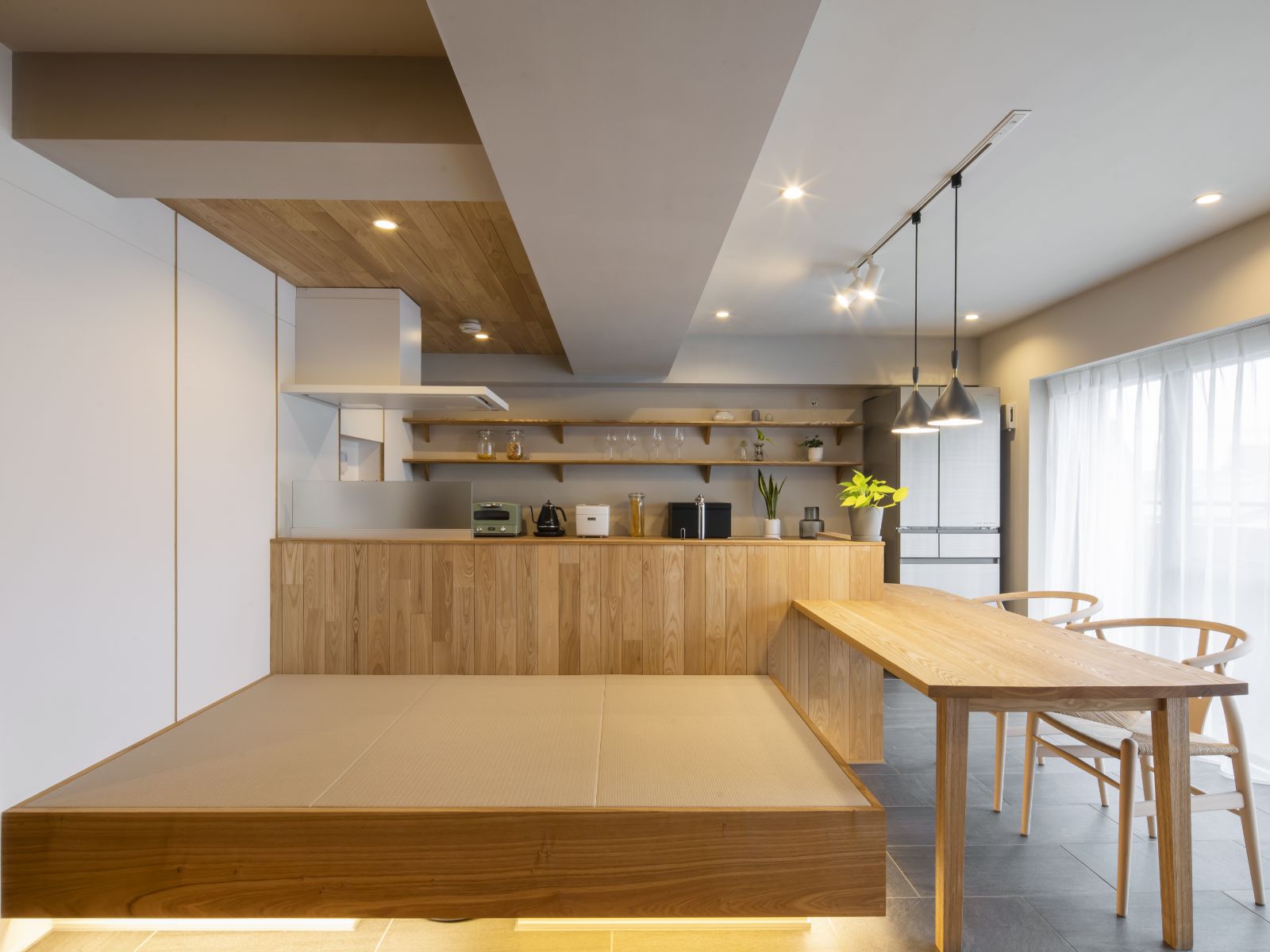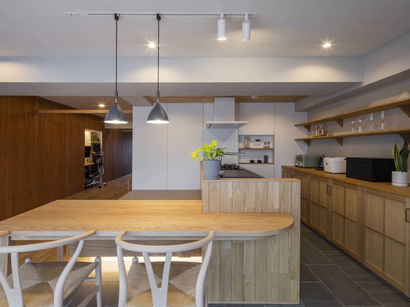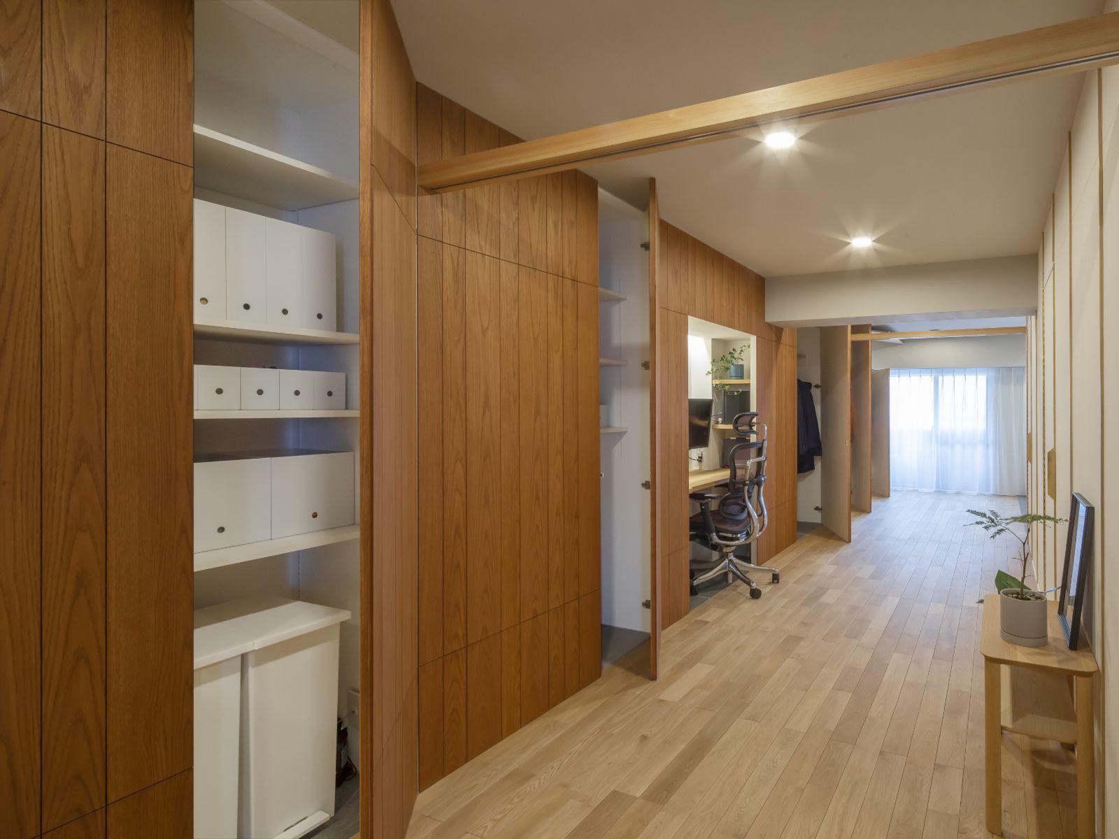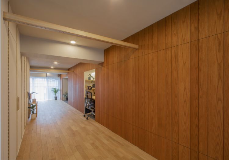 南北に細長いマンションの住まいを、ひとつの「通り部屋」で貫くことで、光と風の通り道を生み出した、フルオーダーのリノベーションモデル。京都の町屋で見られる通り庭をヒントに、マンションでの快適な暮らしを実現しました。